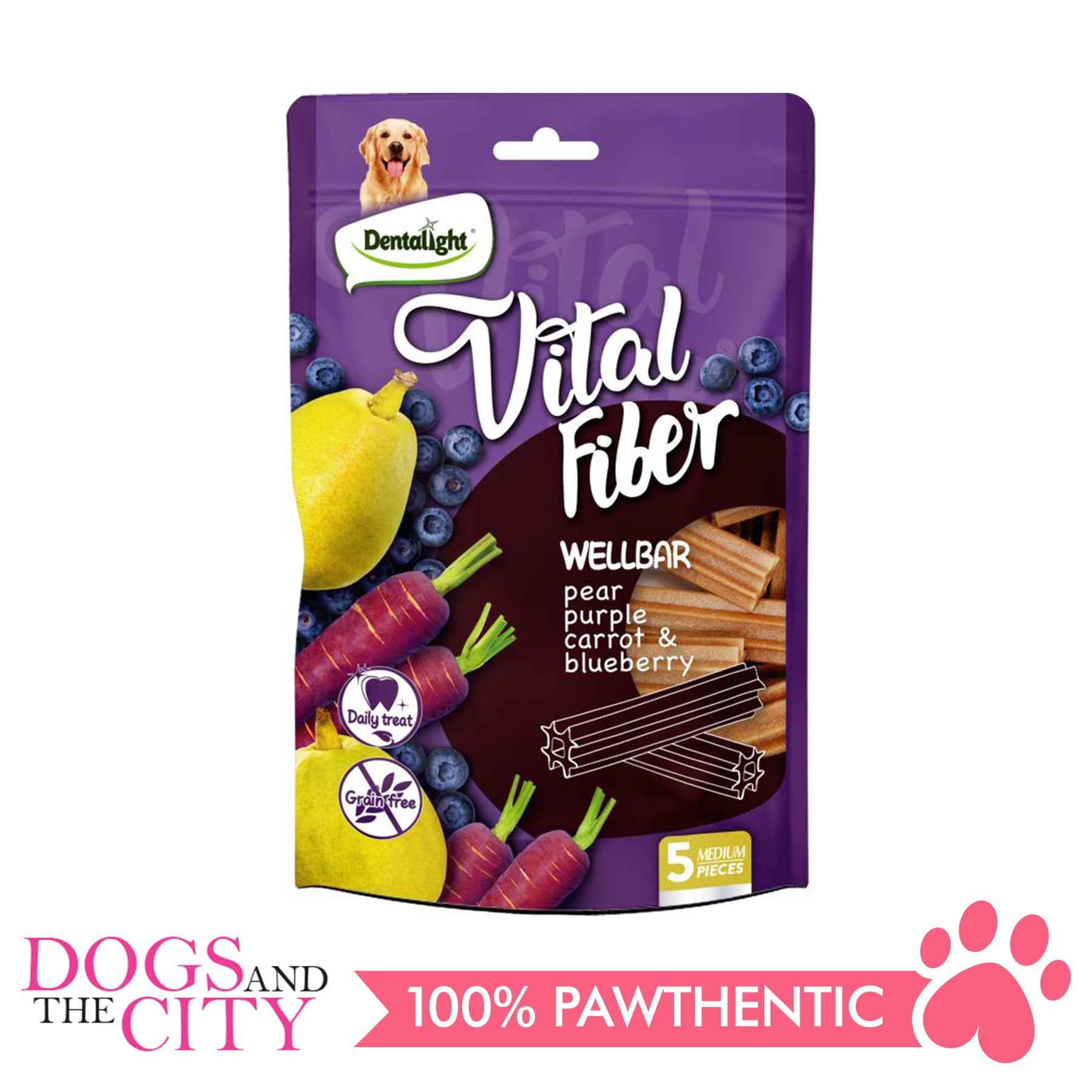 DENTALIGHT 10134 5" Medium Vital Fiber Wellbar×5pcs 85g Pear, Purple Carrot, Blueberry Dog Treats