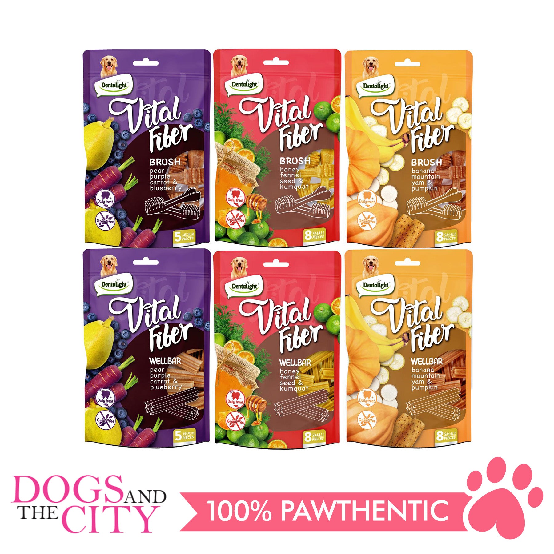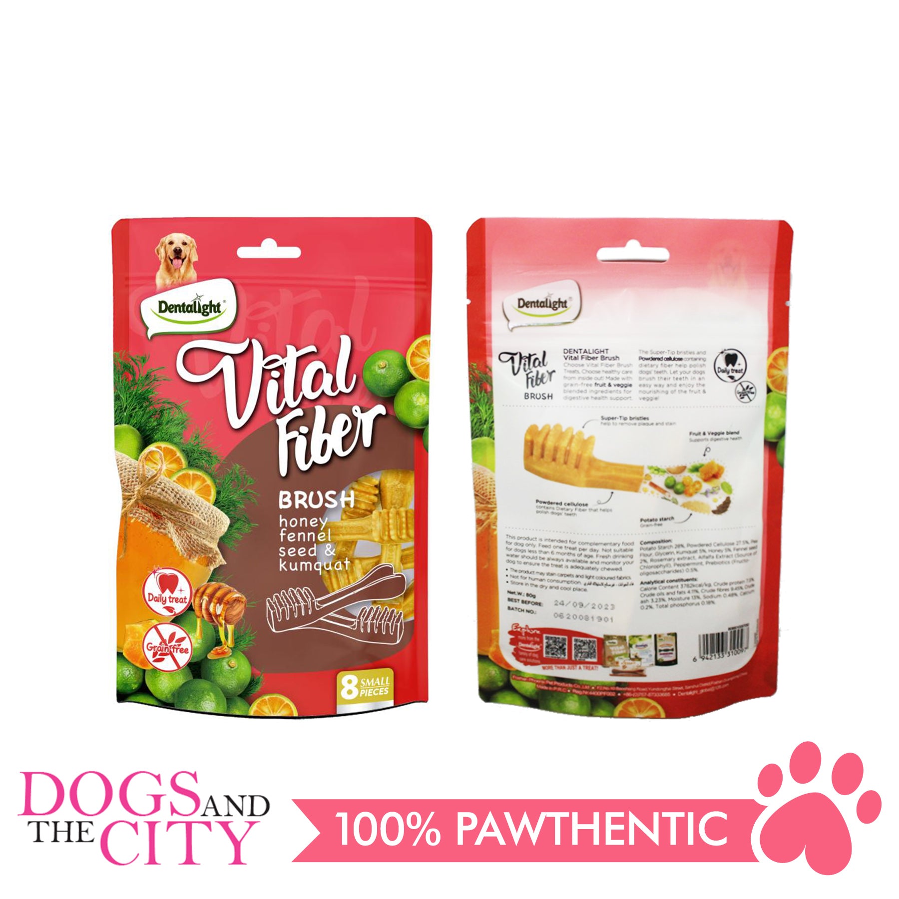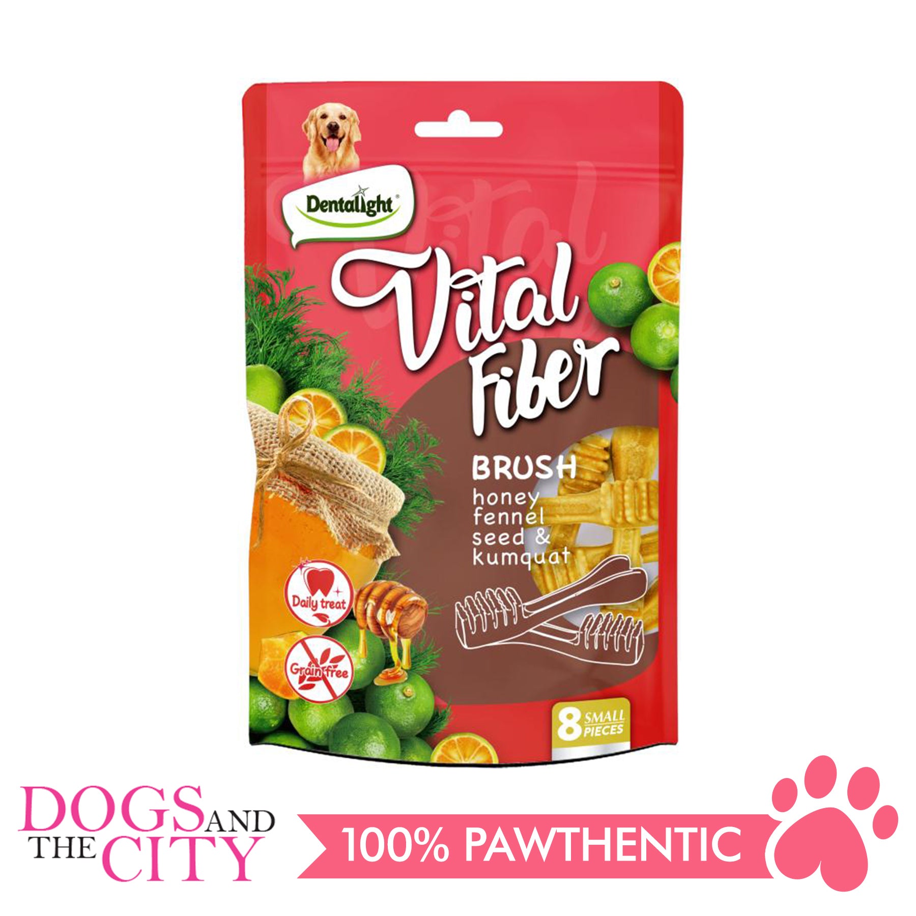 DENTALIGHT 10097 2.7" Small Vital Fiber Brush×8pcs 80g Honey, Fennel Seed, Kumquat Dog Treats