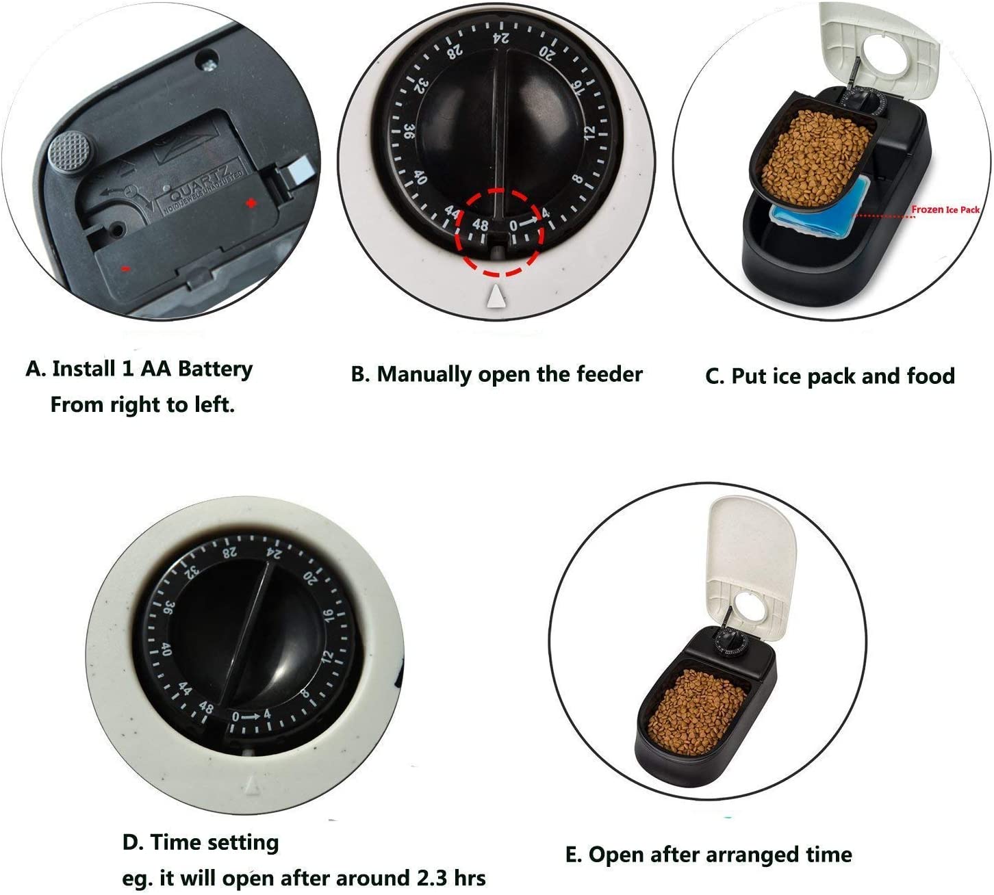 - Easy to Use: This 48hour pet feeder uses AA batteries(Not included) and is easy to operate—fill the feeder trays with dry food, set the timer and done.For pets fed once a day, set 1st timer for 24 hours and 2nd one 48 hours later. For pets fed twice a day, set 1st tray for 12 hours and 2nd one for 24 hours.