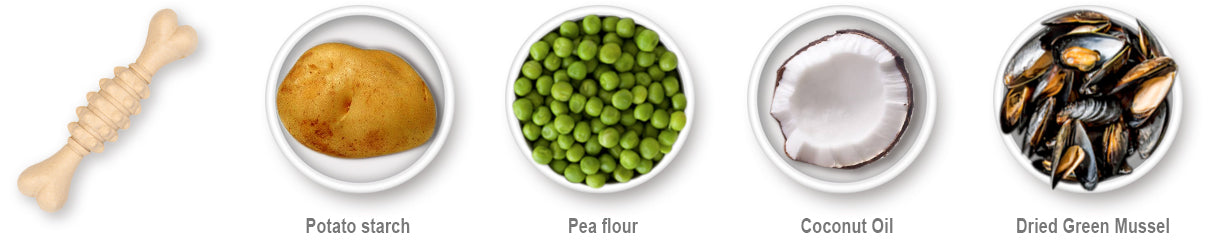 COMPOSITION: Potato starch, Pea flour, Lignocellulose, Glycerine , Apple pomace, Gelatine, Parsley powder, Coconut oil 0.5%, Dried green mussle (source of glucosamine and chondroitin sulfate) 0.5%, Lecithin.