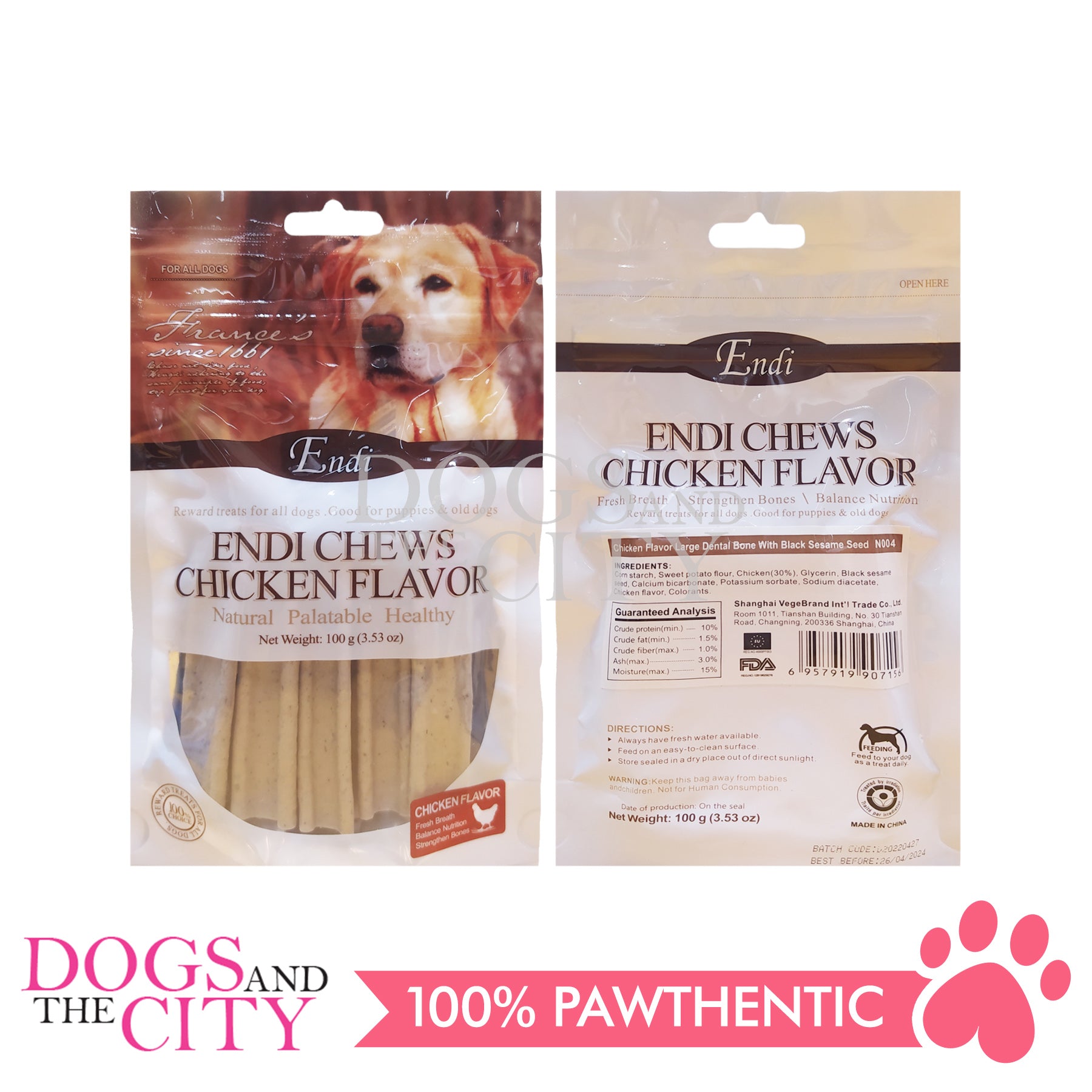 Ingredients: Cornstarch, Sweet Potato flour, Chicken (30%) Glycerin, Black Sesame seed, Calcium bicarbonate, Potassium sorbate, sodium diacetate, chicken flavor, colorants.