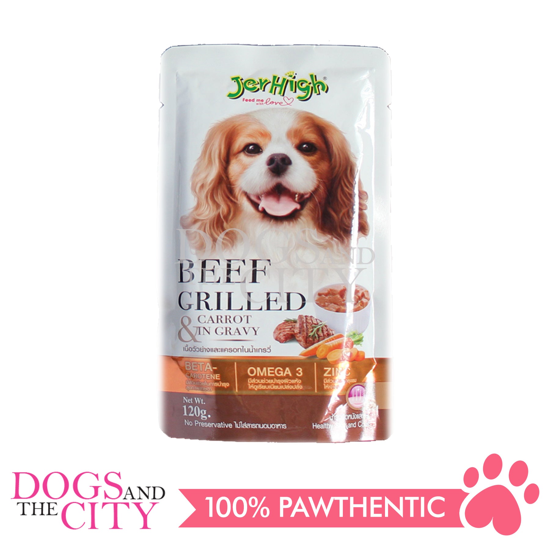 JerHigh Beef Grilled & Carrot In Gravy is a premium dog food suitable for all dog breeds. It is made of full of protein and nutritional value with added omega 3 and zinc to promote healthy skin and fur. It is made from real beef meat mixed with carrot, formed into delectable meaty chunks and topped with our delicious gravy. So terrific that your dog won’t be able to resist! Have it on its own or mix it with kibble to widen your dogs’ palate and increase their appetite.